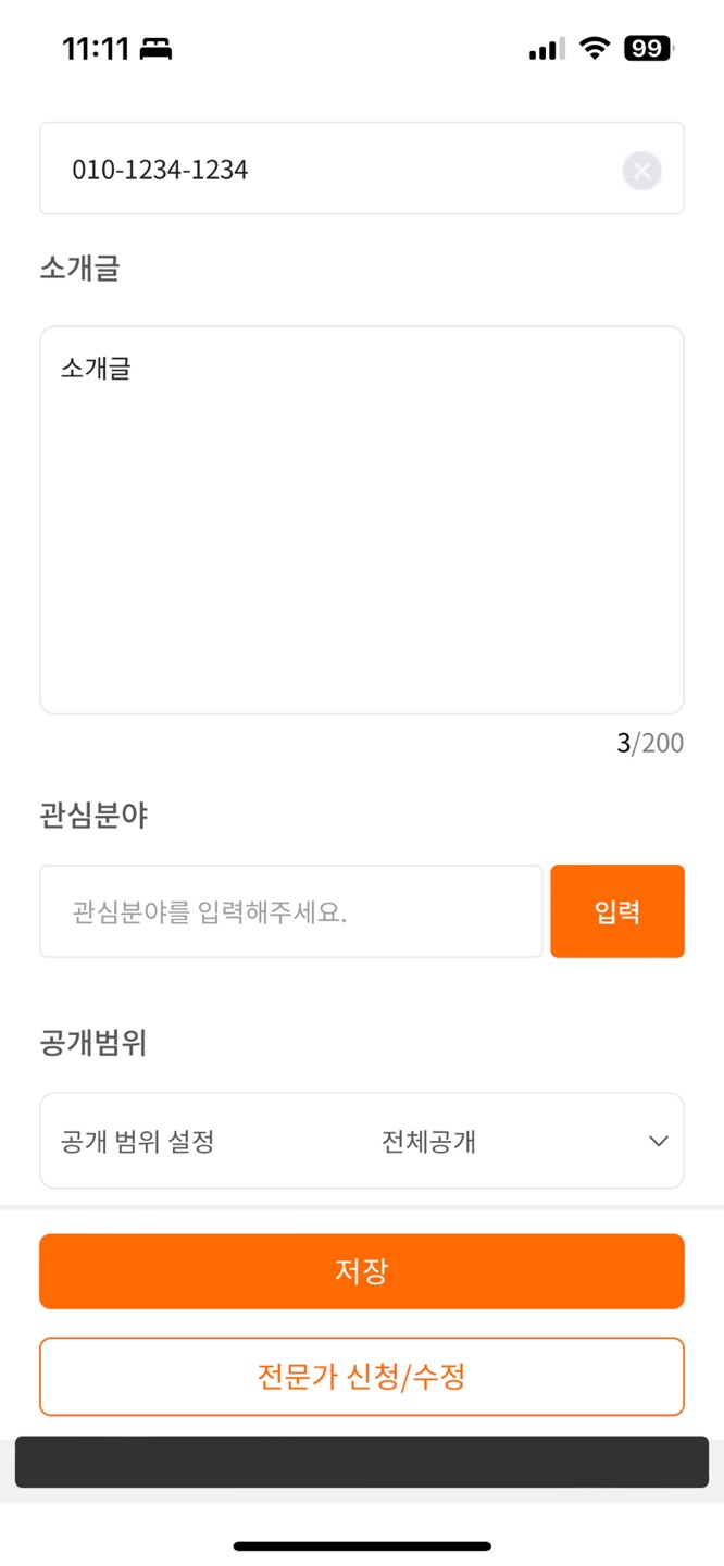 마이 - 프로필 편집 - 저장버튼 하단에 검정색 박스 뜨는걸 아예 없애거나 문구를 추가하고 가운데에 뜨게. 저장버튼 누르면 이전 페이지로 나가게 해주세요.