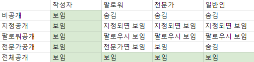 - 의미상 '작성자에게만 공개'는 지정공개와 같지만, 데이터적으로는 "전체공개,팔로워만,전문가만,지정공개,비공개" 외에 "작성자만" 의 값을 가져야 함