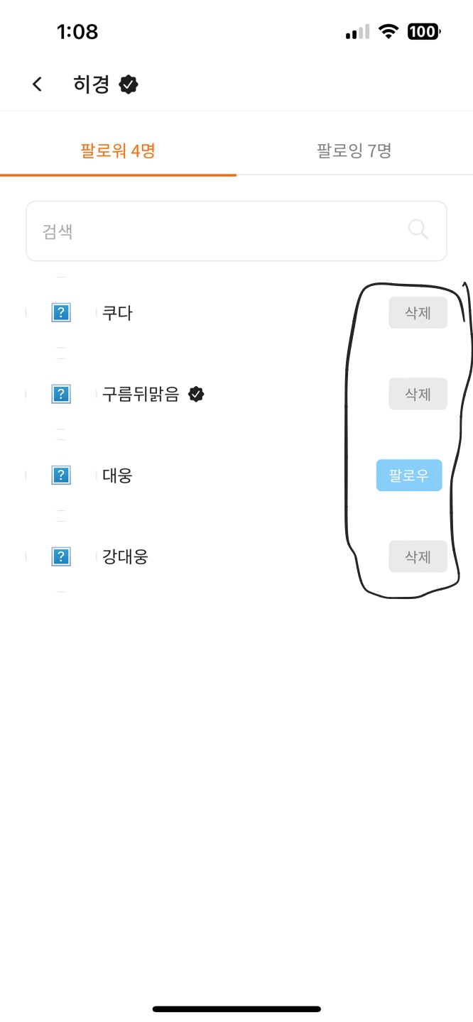 팔로우, 팔로워 리스트 팔로잉, 삭제 버튼 정렬 안 맞음